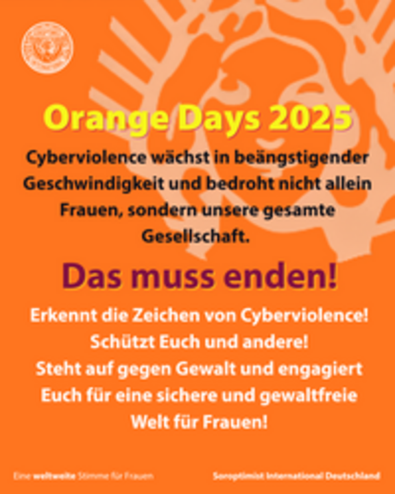 Von 25. November bis 10. Dezember macht Soroptimist International mit der Orange Days Kampagne aufmerksam auf Cyberviolence, Prävention und Hilfsangebote.